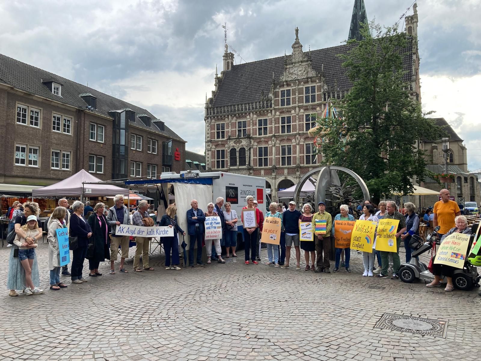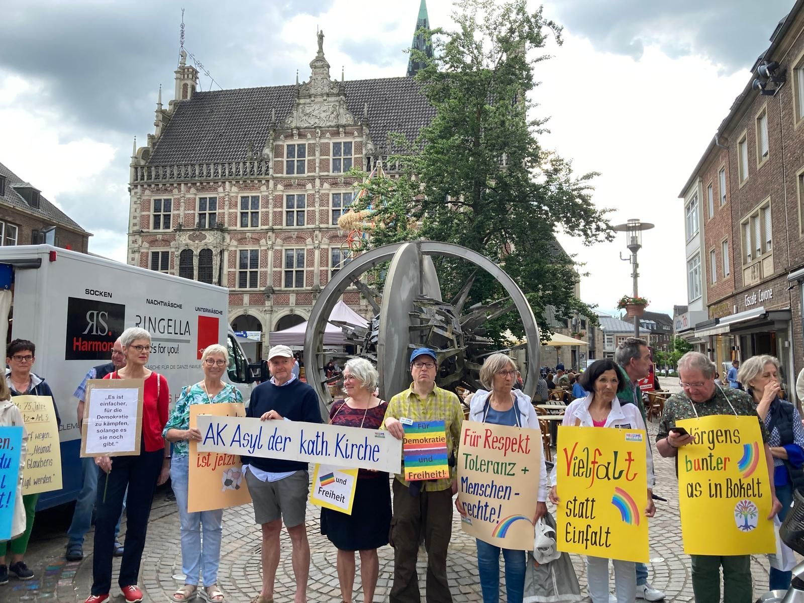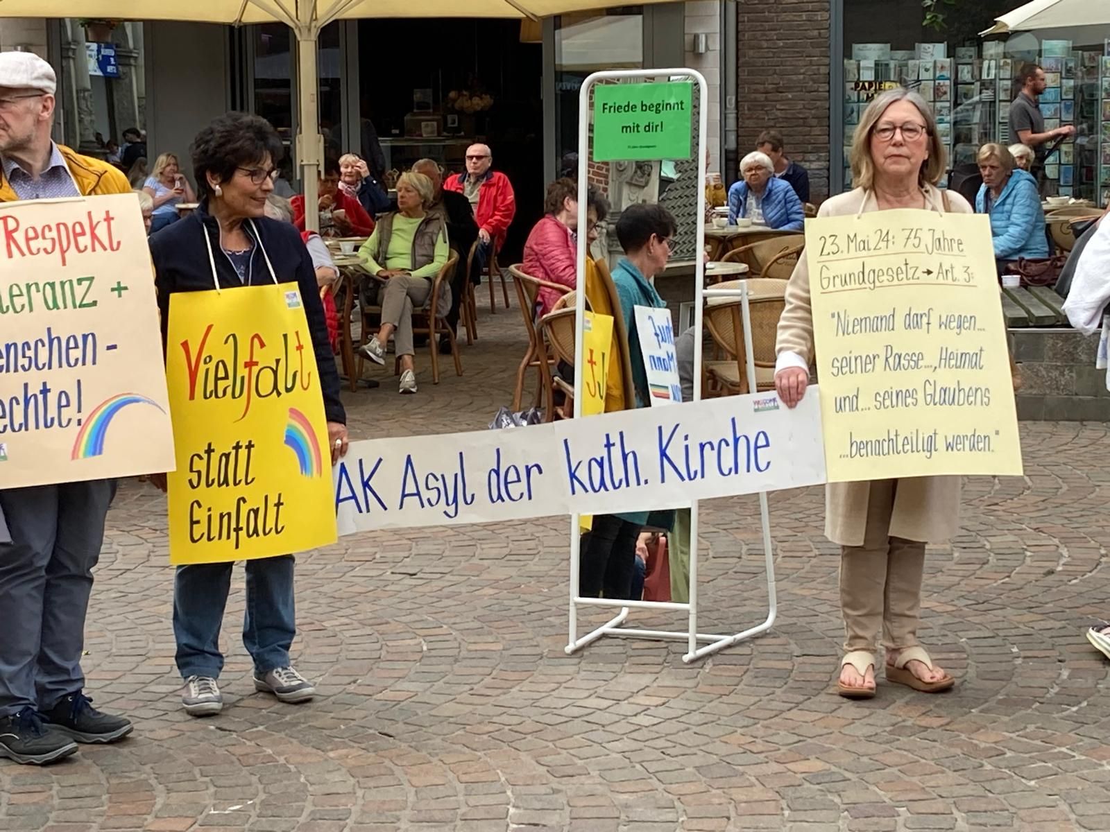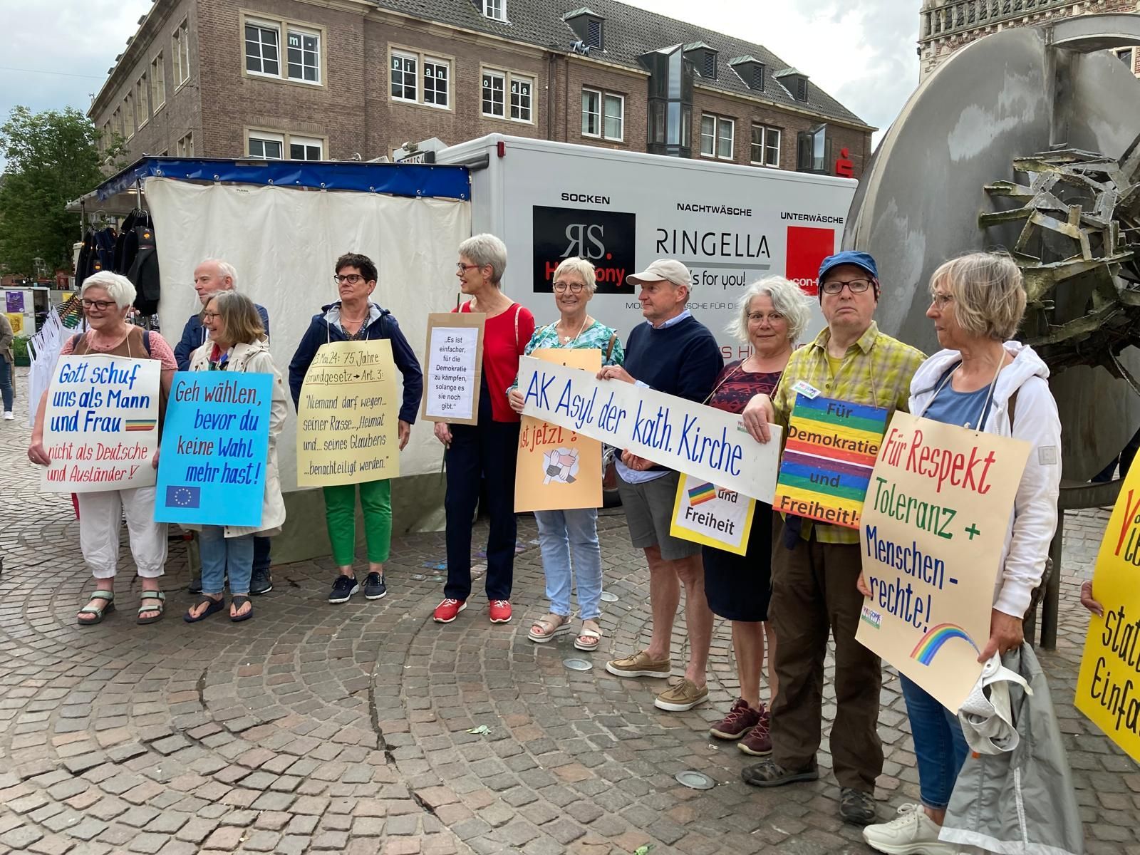 Am 16. Mai 2024 fand die erste Mahnwache des Arbeitskreises Asyl Bocholt auf dem Marktplatz statt. Bis zu 60 Personen kamen zusammen, um mit Plakaten solidarisch zu zeigen, wie wichtig Demokratie und Vielfalt in Deutschland und auch in Bocholt sind. Wir machen uns stark für die europäischen Werte der Gleichheit, Freiheit, Toleranz, Respekt und Menschenrechte. Gleichzeitig setzen wir uns ein für Dialog und die Würde jedes Menschen - egal welcher Herkunft, Hautfarbe, Religion oder Weltanschauung.