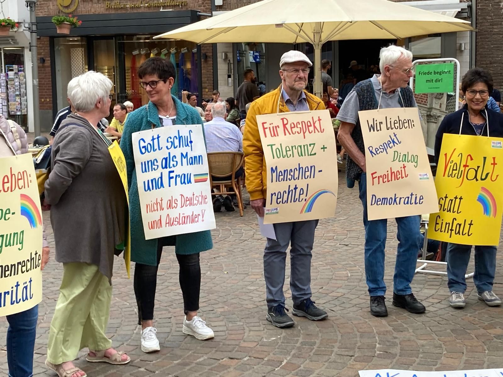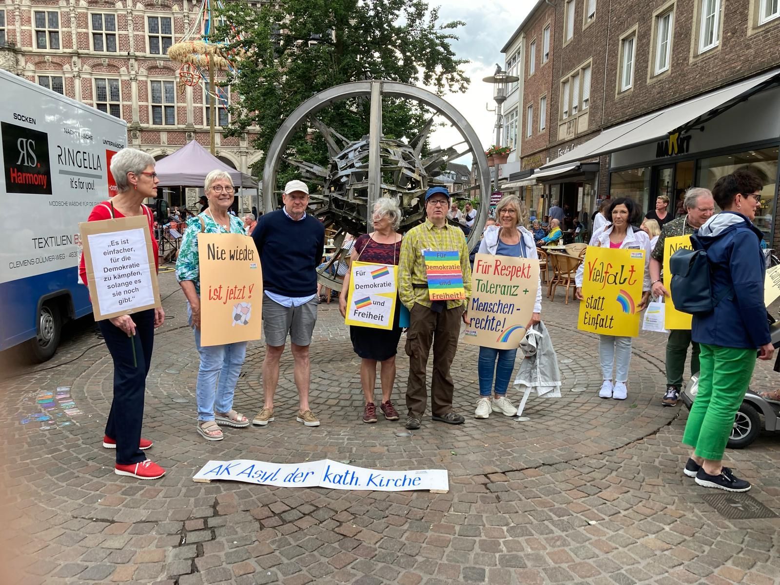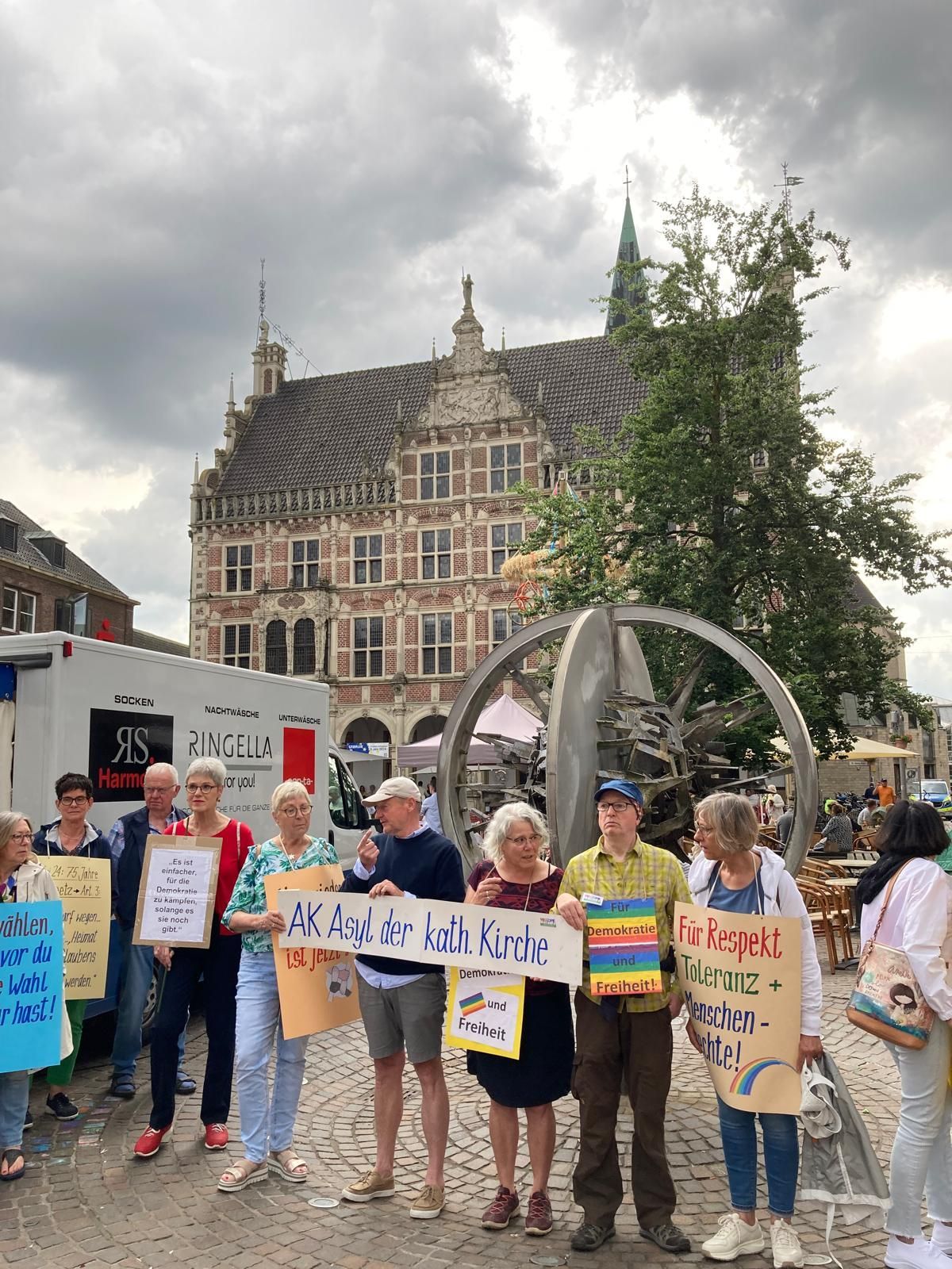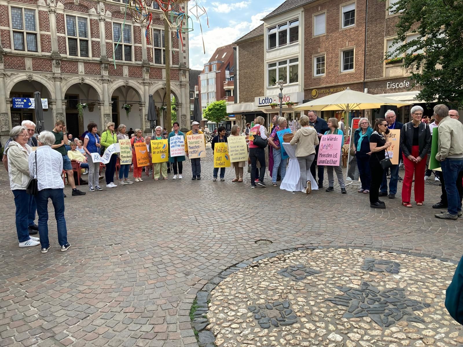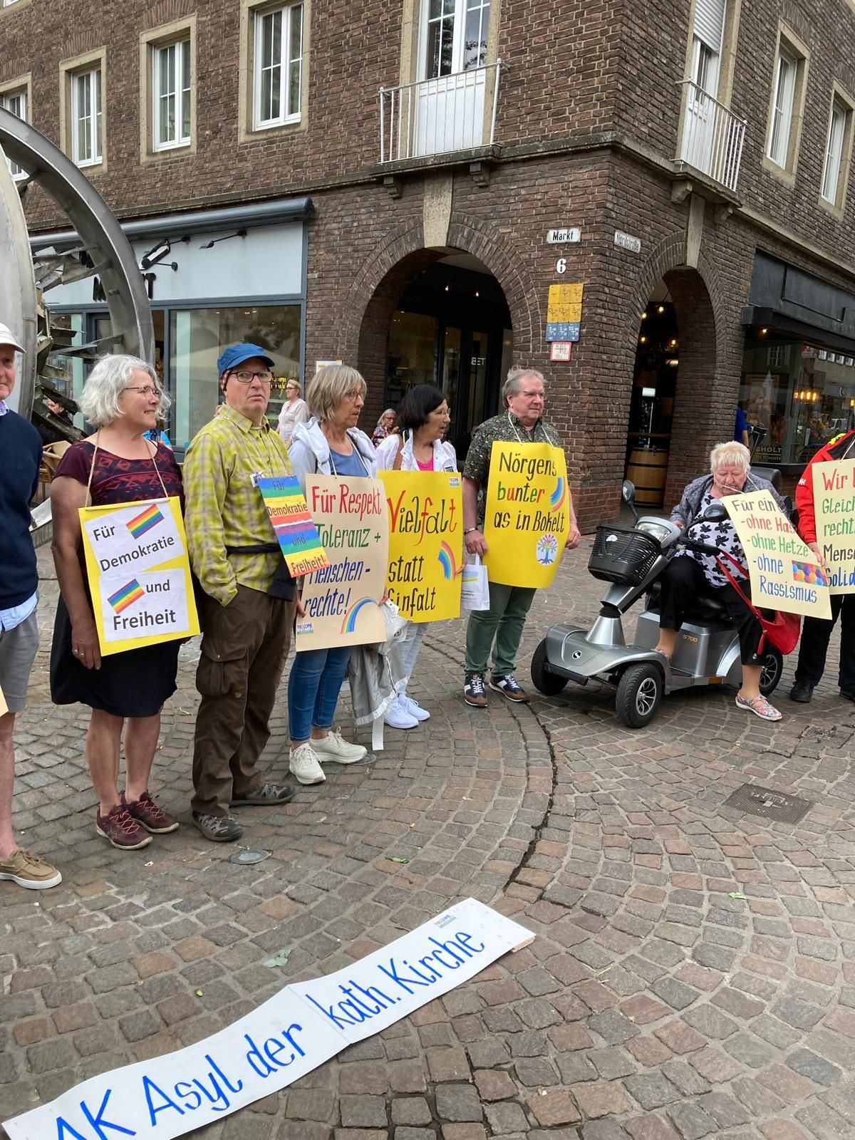 Am 16. Mai 2024 fand die erste Mahnwache des Arbeitskreises Asyl Bocholt auf dem Marktplatz statt. Bis zu 60 Personen kamen zusammen, um mit Plakaten solidarisch zu zeigen, wie wichtig Demokratie und Vielfalt in Deutschland und auch in Bocholt sind. Wir machen uns stark für die europäischen Werte der Gleichheit, Freiheit, Toleranz, Respekt und Menschenrechte. Gleichzeitig setzen wir uns ein für Dialog und die Würde jedes Menschen - egal welcher Herkunft, Hautfarbe, Religion oder Weltanschauung.