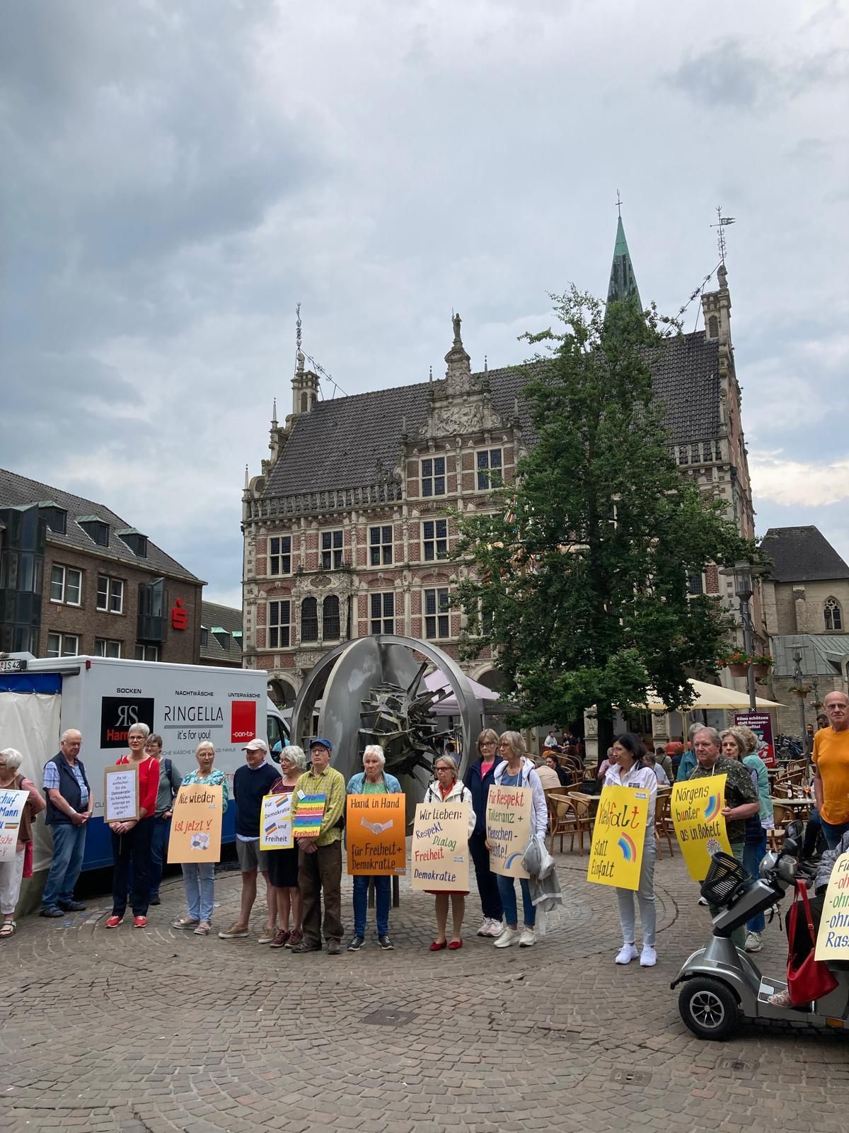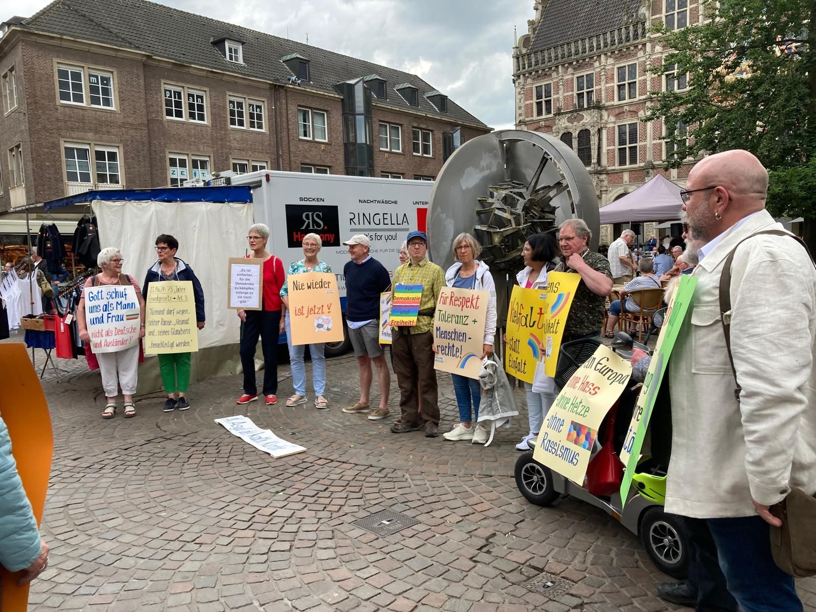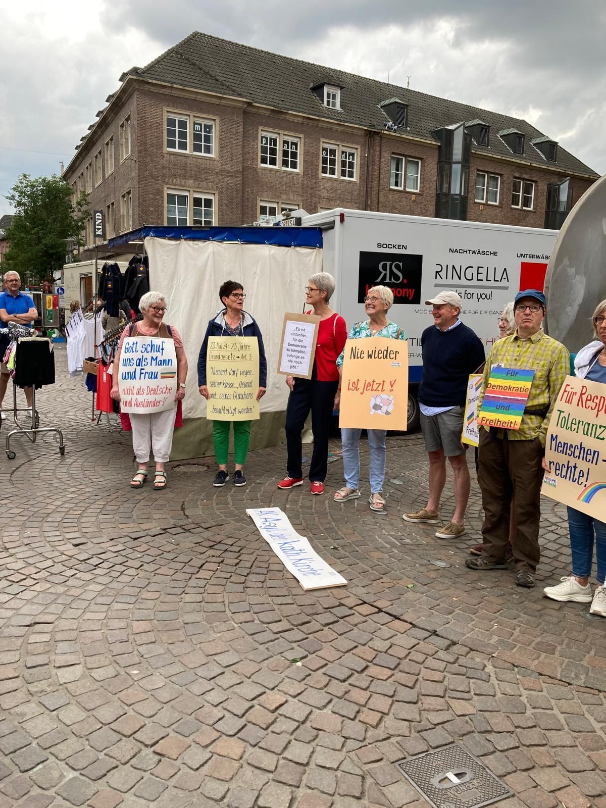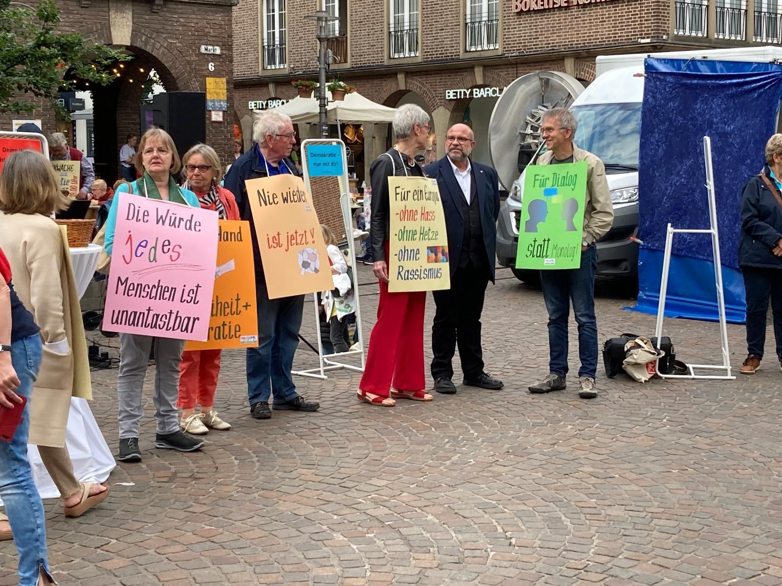 Am 16. Mai 2024 fand die erste Mahnwache des Arbeitskreises Asyl Bocholt auf dem Marktplatz statt. Bis zu 60 Personen kamen zusammen, um mit Plakaten solidarisch zu zeigen, wie wichtig Demokratie und Vielfalt in Deutschland und auch in Bocholt sind. Wir machen uns stark für die europäischen Werte der Gleichheit, Freiheit, Toleranz, Respekt und Menschenrechte. Gleichzeitig setzen wir uns ein für Dialog und die Würde jedes Menschen - egal welcher Herkunft, Hautfarbe, Religion oder Weltanschauung.