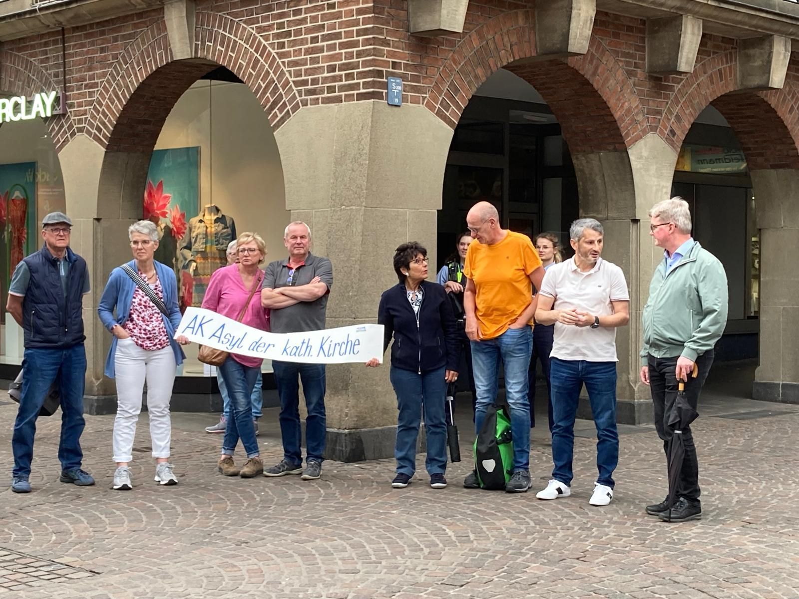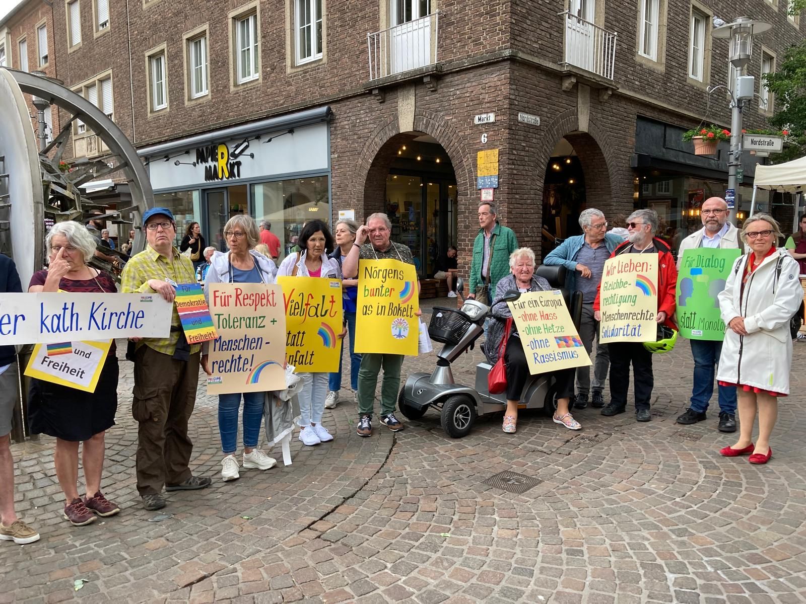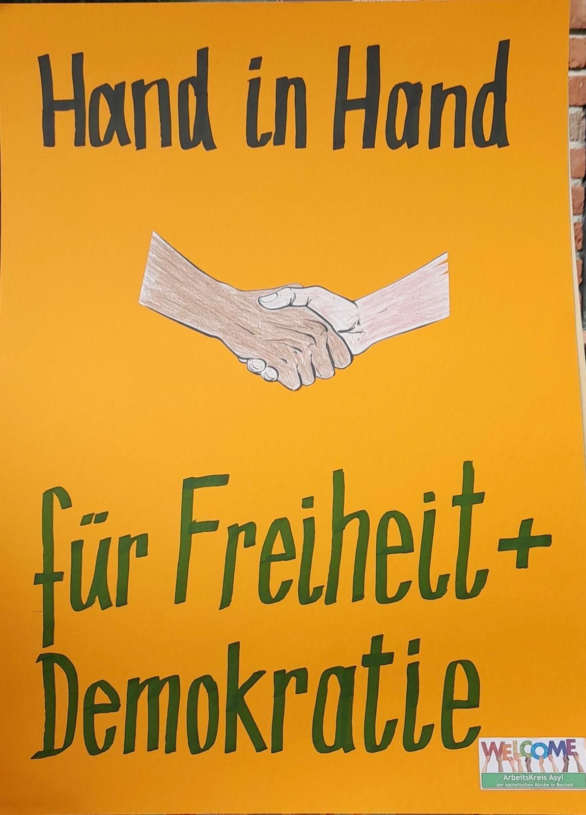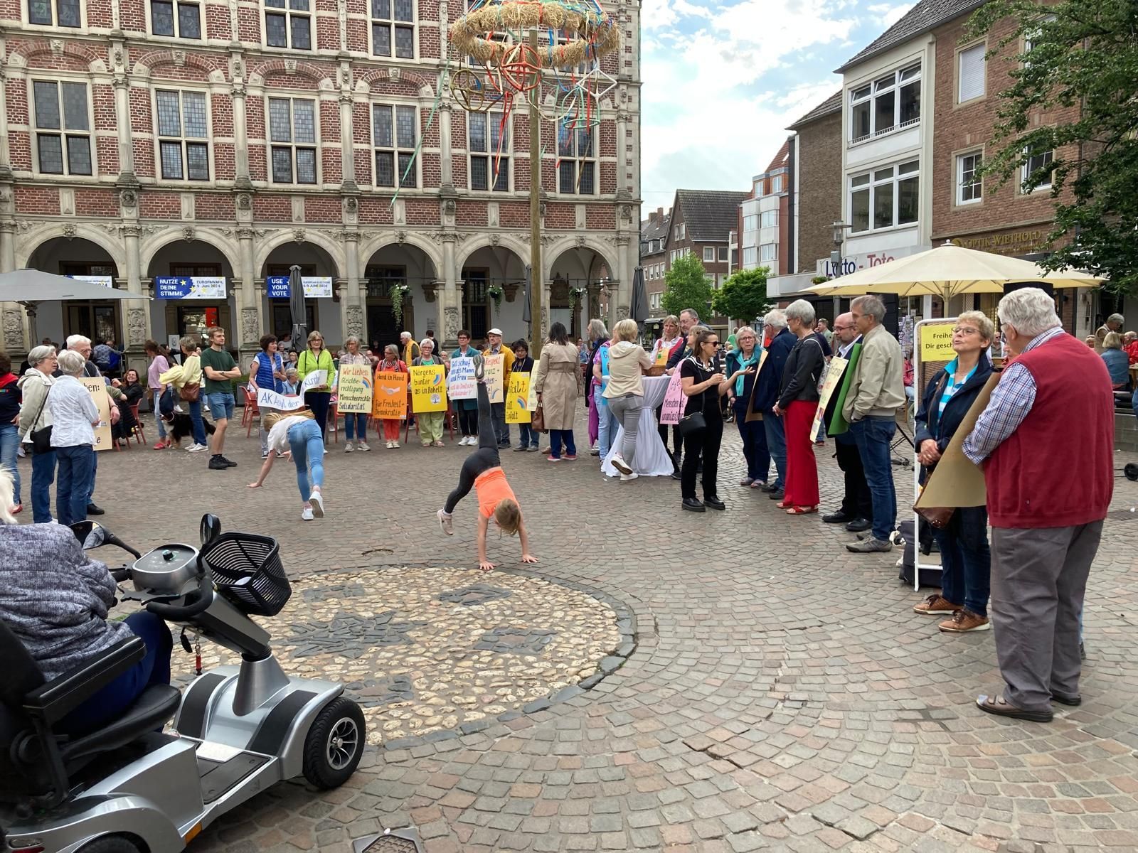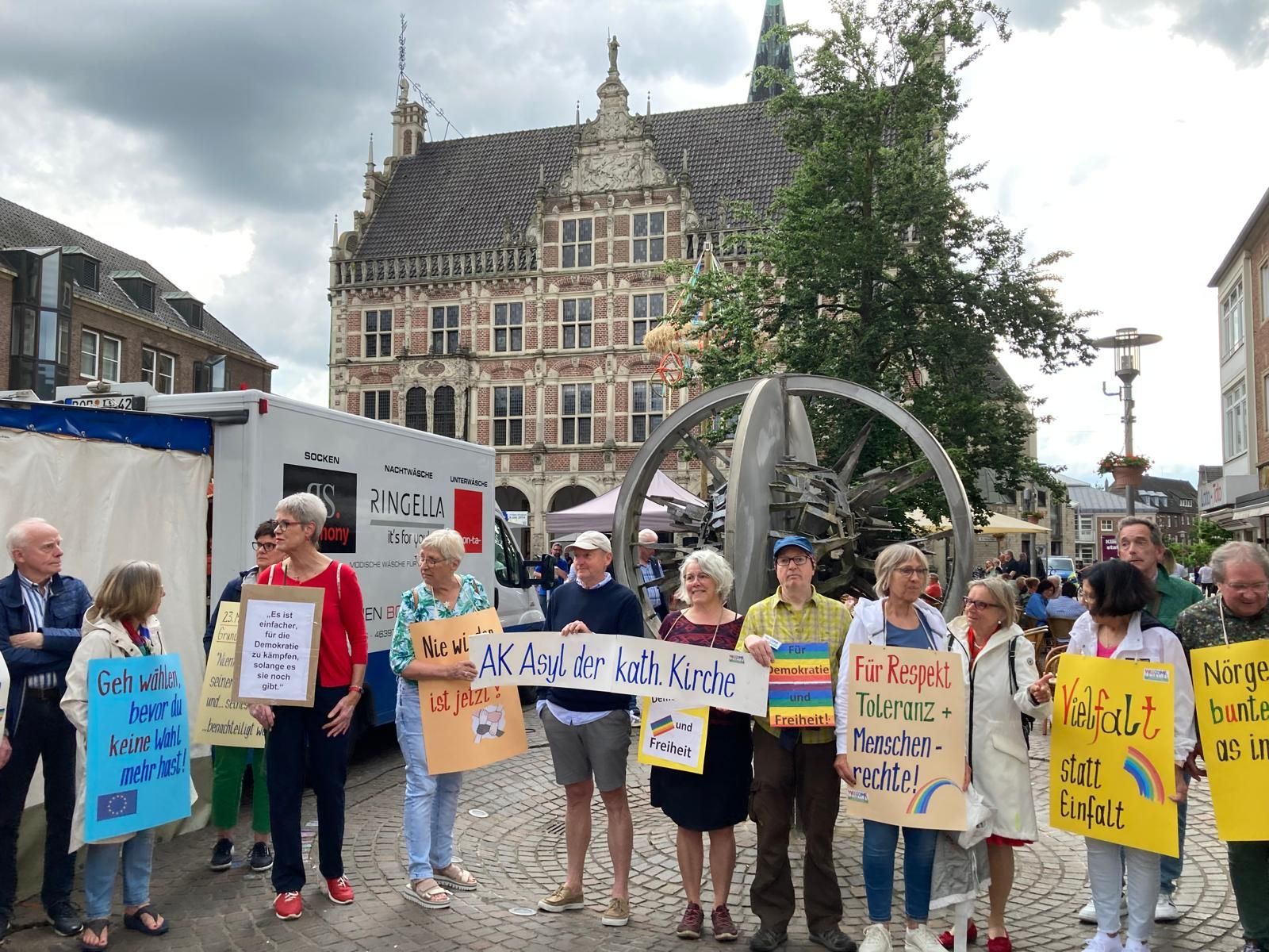 Am 16. Mai 2024 fand die erste Mahnwache des Arbeitskreises Asyl Bocholt auf dem Marktplatz statt. Bis zu 60 Personen kamen zusammen, um mit Plakaten solidarisch zu zeigen, wie wichtig Demokratie und Vielfalt in Deutschland und auch in Bocholt sind. Wir machen uns stark für die europäischen Werte der Gleichheit, Freiheit, Toleranz, Respekt und Menschenrechte. Gleichzeitig setzen wir uns ein für Dialog und die Würde jedes Menschen - egal welcher Herkunft, Hautfarbe, Religion oder Weltanschauung.