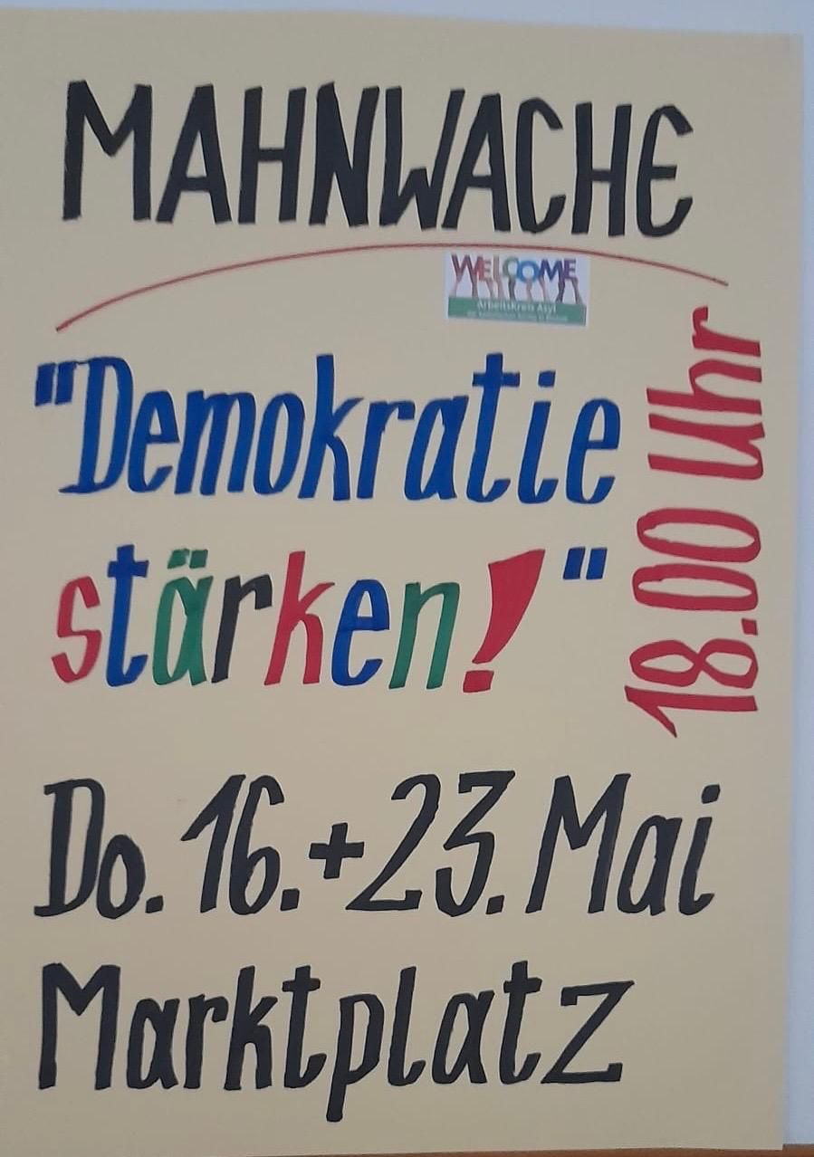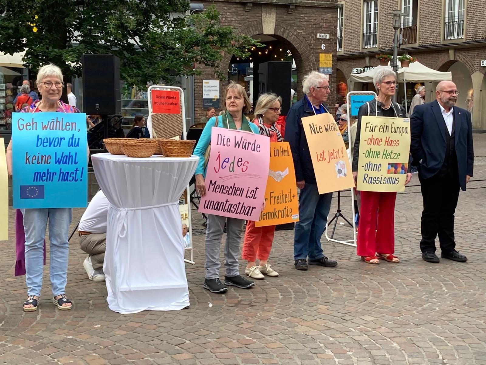 Wir bedanken uns bei allen für ihre Solidarität und Unterstützung, denn in Zeiten von Populismus und Gefährdung durch antidemokratische Kräfte ist es außerordentlich wichtig, Flagge zu zeigen. Daher wurde am 23. Mai 2024 eine zweite Mahnwache auf dem Marktplatz veranstaltet. Damit machen wir uns stark für Europa, Demokratie und Vielfalt in unserer Gesellschaft und setzen ein Zeichen der Solidarität mit Menschen aller Kulturen, die unter uns leben.