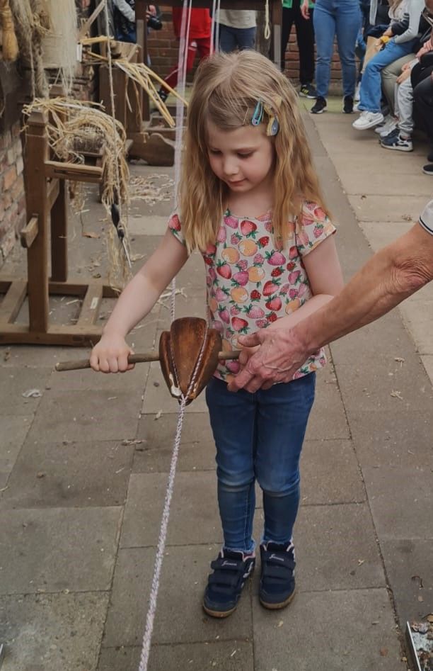 Dann ging’s ab zum Seil winden. Hier zeigten mal wieder die Kinder besonderen Einsatz. Vier aus Hanf gefertigte Einzelstränge mussten durch Spannen und Kurbeln unter Einsatz von Muskelkraft zusammengewunden werden, um ein Seil zu ergeben. Auch das klappte prima.