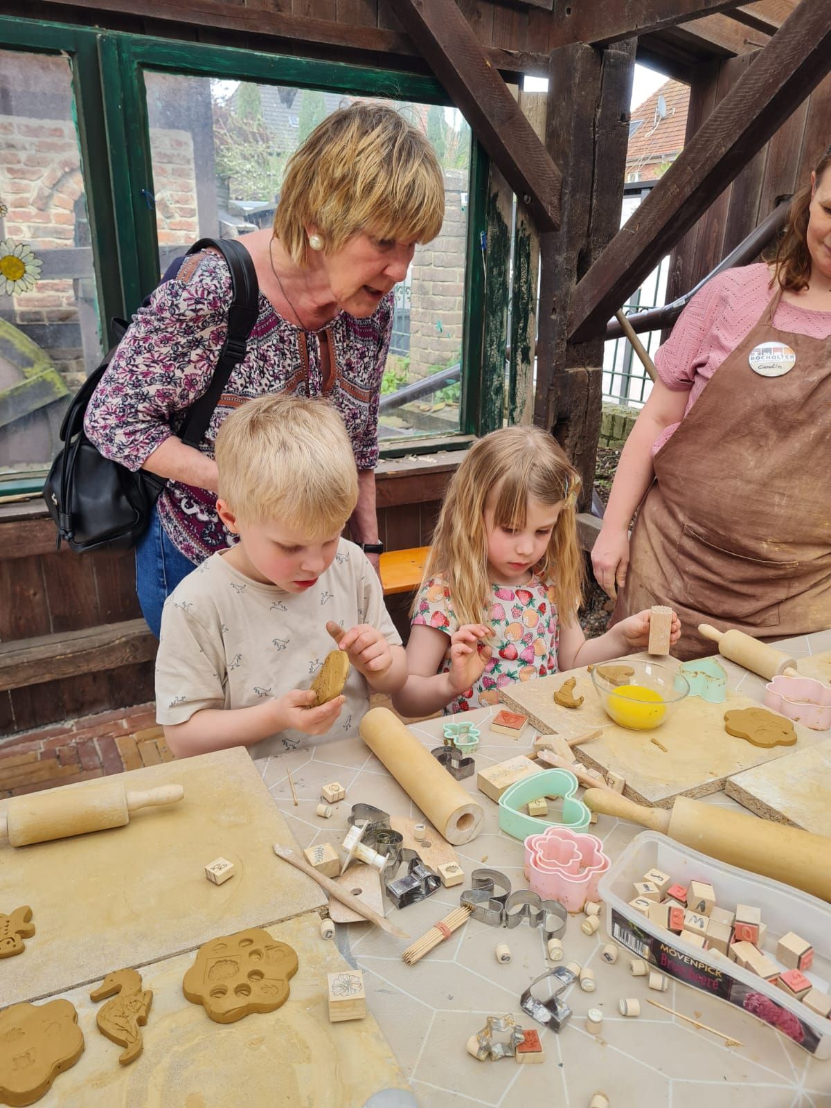 Gestartet wurde in der Schreinerei, wo die alten Werkbänke mit den beeindruckend großen Schraubstöcken, den Sägen und Hobeln zunächst bestaunt und dann von den Kindern, zumindest was das Hobeln betrifft, aktiv ausprobiert wurden. In Holzschuhen erkundeten die Jungen und Mädchen auch die entlegendsten Ecken des Hauses und ließen sich schließlich mit Mama oder Papa im „Fotostudio nach alter Zeit“ neben den lebensgroßen Puppen im Sonntagsoutfit fotografieren. Das Beste kam allerdings zum Schluss: Am Ausgang der Schreinerei wartete auf
